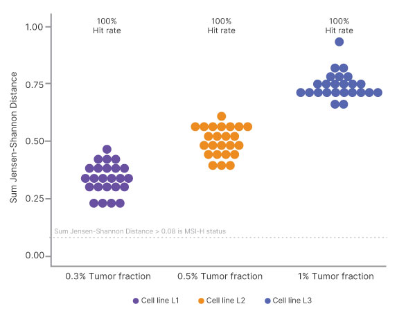 현미부수체 불안정성(MSI)은 알려진 MSI-High 상태의 3개의 세포주 (샘플 1~3)에서 평가되었으며, 약 2300개의 동종중합체 부위를 평가하여 종양 분획이 0.3%까지 검출되었습니다.