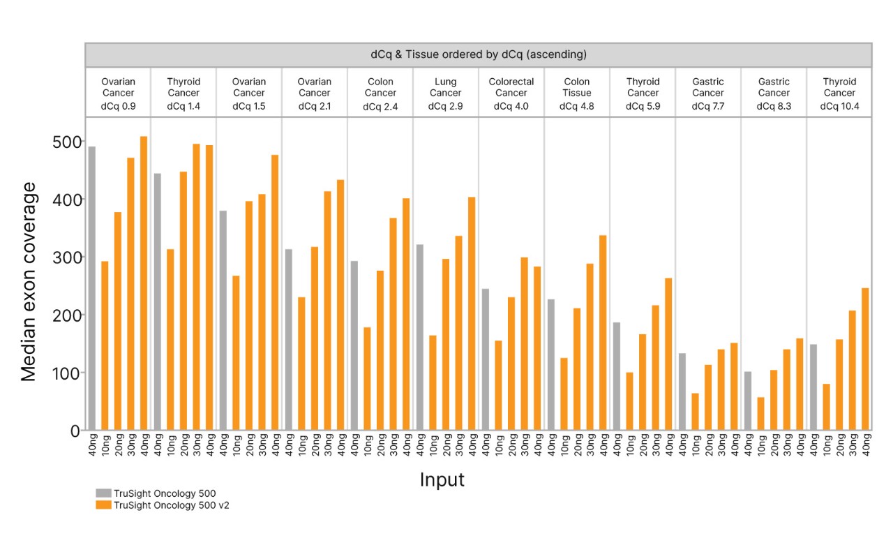 TruSight Oncology 500 v2는 10~40 ng DNA 투입에 대해 13가지 암 유형에 걸쳐 원래 TruSight Oncology 500에 비해 개선된 엑손 커버리지 중앙값을 보였습니다. 대부분의 조건에서, 특히 낮은 투입 수준에서 개선된 엑손 커버리지가 관찰되었습니다.