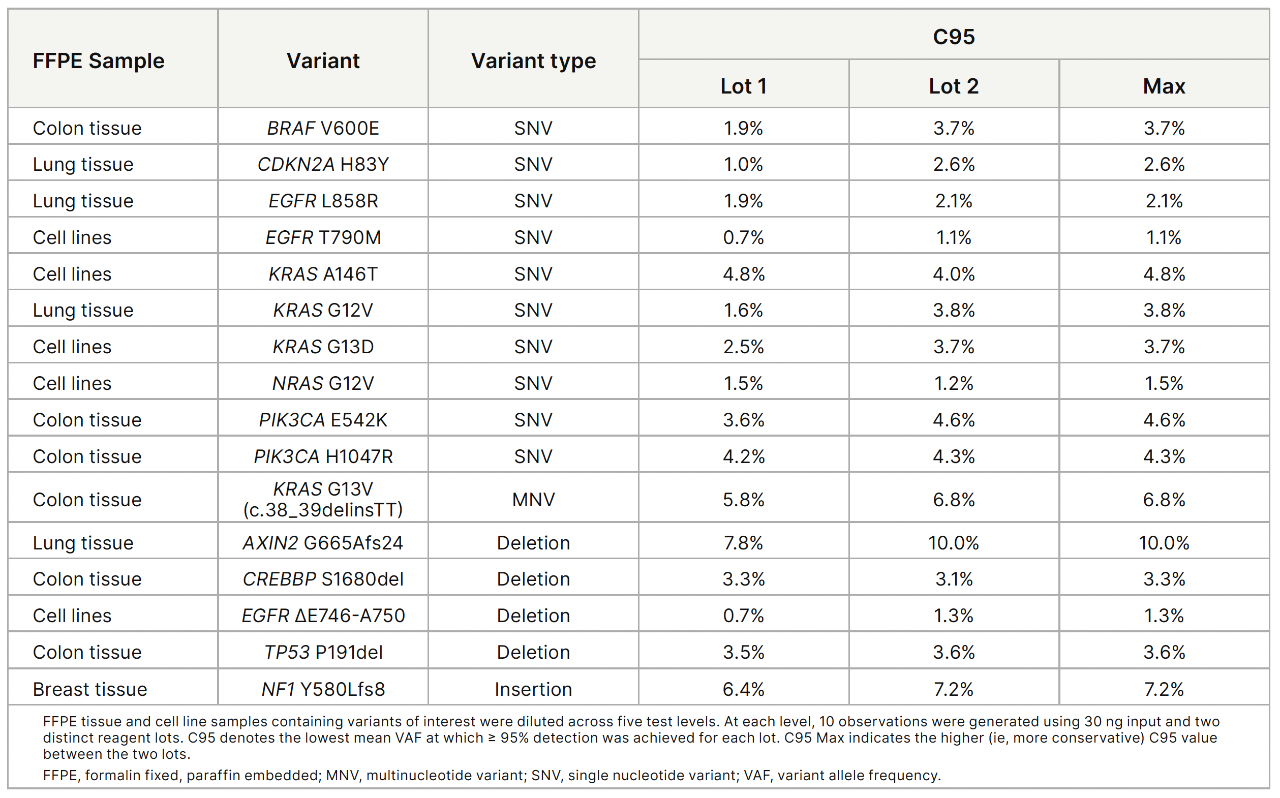 TruSight Oncology 500 v2는 입력 수준 및 시약 로트 전반에서 단일 뉴클레오티드 변이(SNV), 다중 뉴클레오티드 변이(MNV), 인델의 정확한 검출을 보였습니다.
