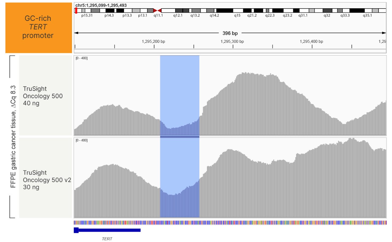 TruSight Oncology 500 v2는 PCR로 증폭하기 어려운 TERT 프로모터와 같은 GC가 풍부한 영역의 커버리지를 개선했습니다.