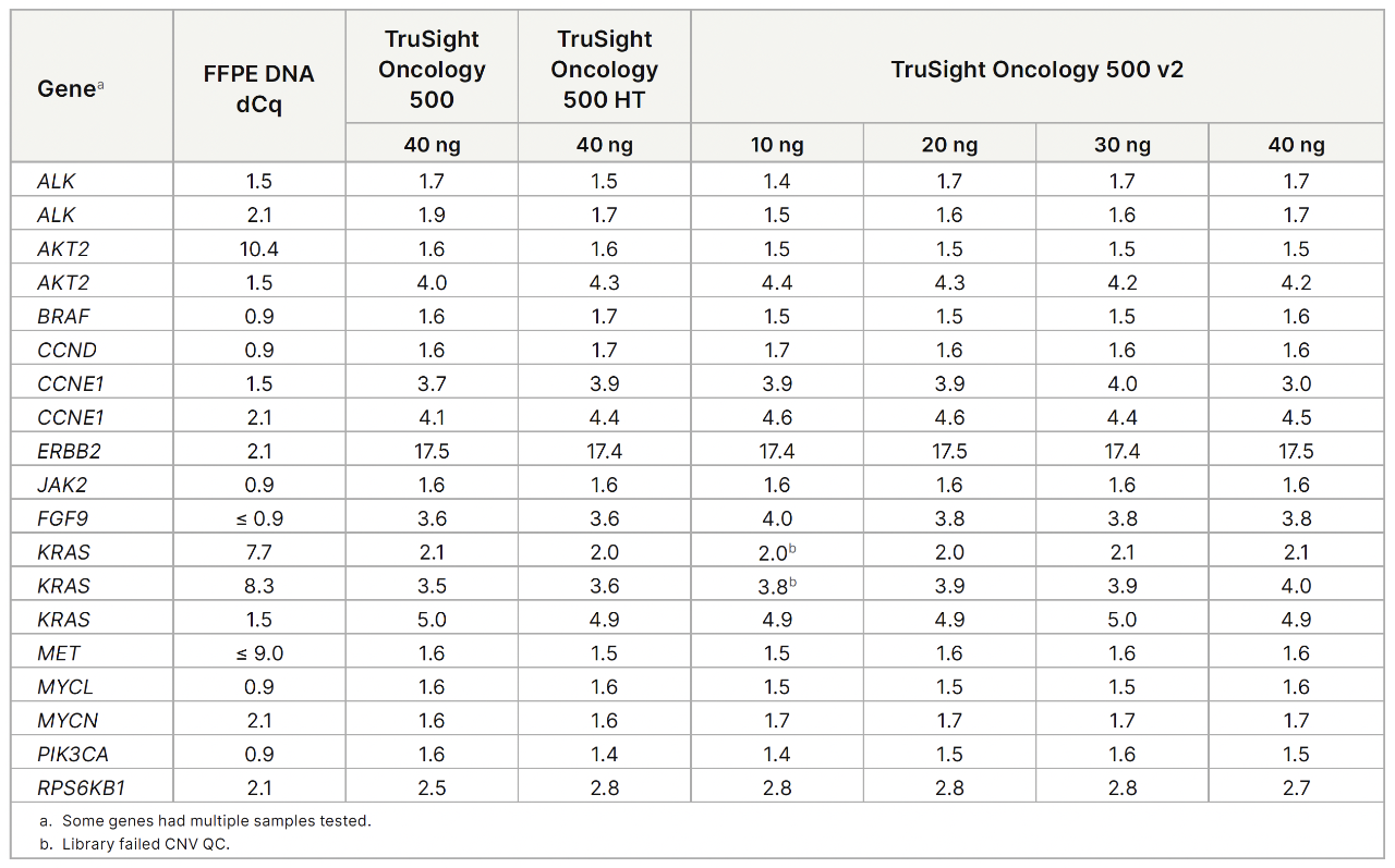 TruSight Oncology 500 v2는 평균 배수 변화로 나타난 바와 같이 신뢰할 수 있는 복제수 변이(CNV) 검출을 입증했습니다. 10~40 ng DNA 투입에 대해 일관된 성능이 관찰되었습니다.