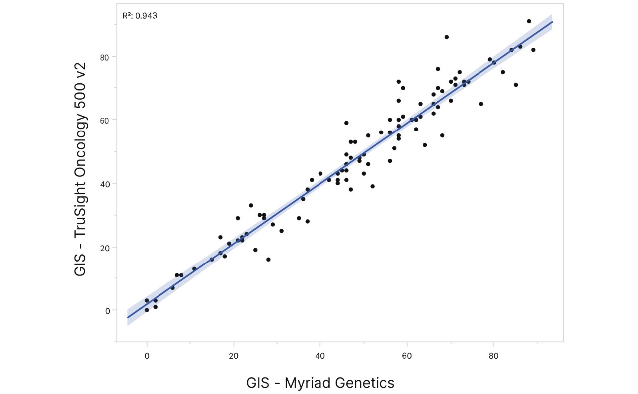 30 ng DNA 투입을 사용한 TruSight Oncology 500 v2의 GIS 결과는 102개의 FFPE 조직 검체 전반에서 대조 검사와 높은 일치성을 보였습니다.