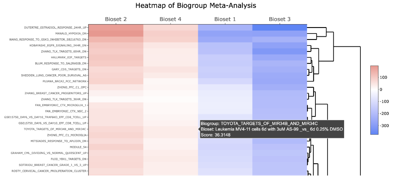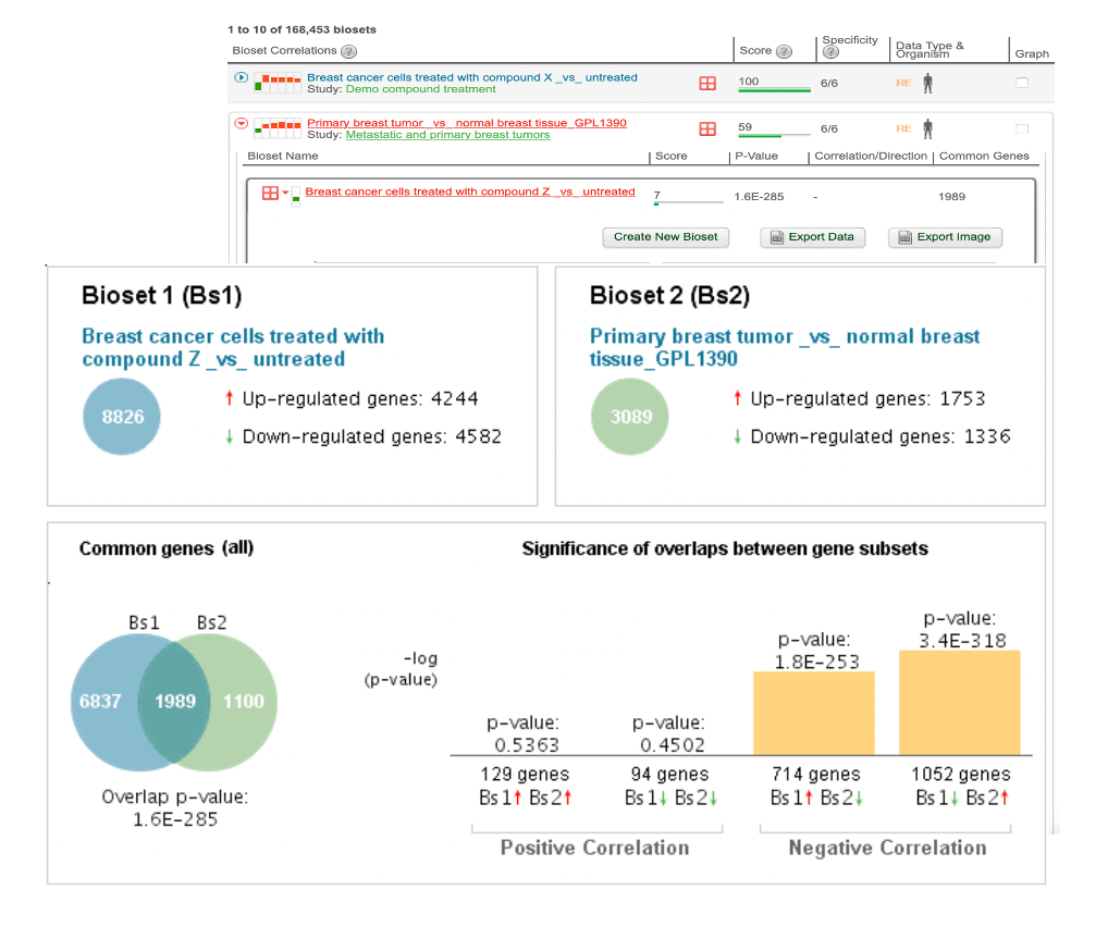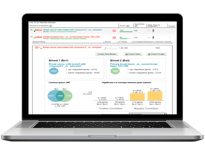 작용 기전을 파악하기 위한 경로와 같은 생물학적 상태 또는 기능에 해당하는 유전자 시그니처뿐만 아니라 공개 데이터 또는 내부 데이터의 유전자 시그니처와의 상관관계를 찾습니다.