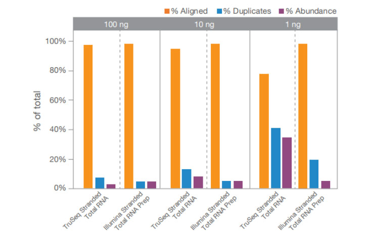Illumina Total RNA Prep with Ribo-Zero Plus는 유전자 및 전사물 풍부도를 정확하게 측정하고, coding 및 다양한 형태의 noncoding RNA에서 알려진 특징과 새로운 특징을 모두 검출할 수 있습니다. 연구자들은 대체 전사물, gene fusion, 대립유전자 특이적 발현의 발견에 대한 확신을 가질 수 있습니다. 또한 Illumina Stranded Total RNA Prep with Ribo-Zero Plus Microbiome은 메타트랜스크립토믹 애플리케이션에 고품질 데이터를 제공합니다.