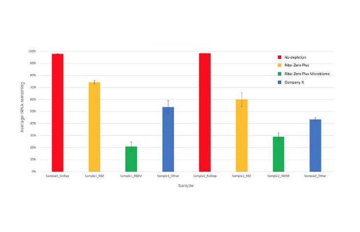 Ribo-Zero Plus Microbiome rRNA Depletion 키트는 대변 샘플에서 rRNA(5S, 16S 및 23S) 수치를 효과적으로 제거합니다. 결과는 두 개의 대변 샘플 혼합물(샘플 1 및 샘플 2)을 사용하여 회사 X의 Ribo-Zero Plus rRNA Depletion Kit 및 시중에서 구할 수 있는 리보핵산제거 키트와 비교됩니다.
